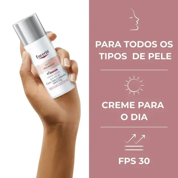 O Eucerin Anti-Pigment Dia FPS 30 é um creme facial de uso diário que reduz as manchas escuras no rosto, além de prevenir o desenvolvimento de hiperpigmentação ou o seu reaparecimento. Ainda, protege contra os raios UVA e UVB, uma vez que a exposição solar pode contribuir com o aparecimento das manchas.