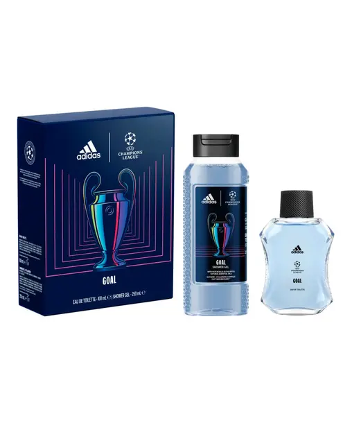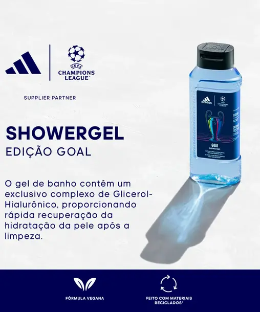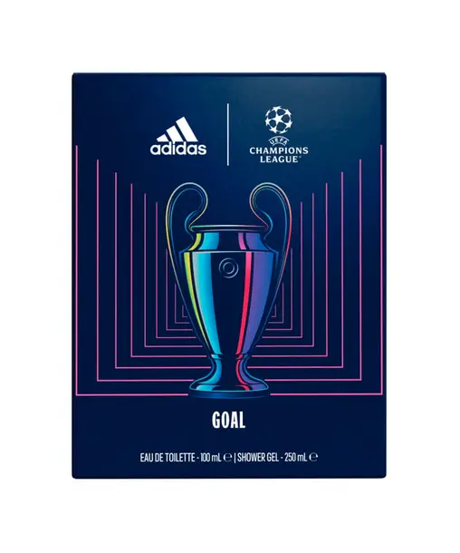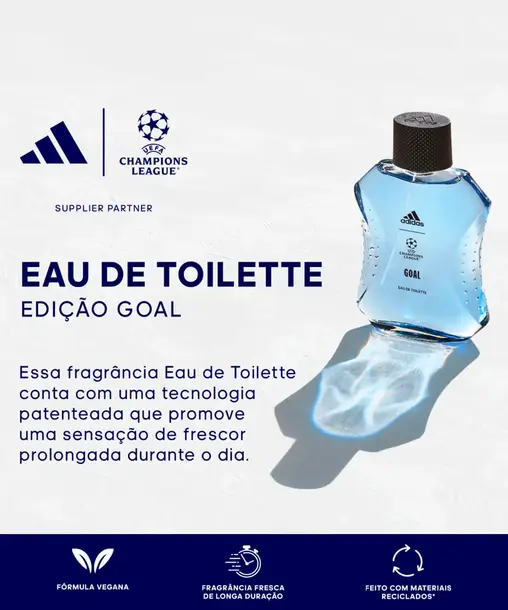 O kit Adidas UEFA Champions League Edição Goal, é composto por 1 perfume Adidas eau de toilette de 100ml e 1 shower gel Adidas de 250ml. O perfume é um aromático verde com longa duração, que possui uma fragrância refrescante e poderosa com um toque amadeirado e fresco. Conta com uma tecnologia patenteada que promove uma sensação de frescor prolongada durante o dia. Nas notas de topo temos abacaxi, laranja e cardamomo. Já nas notas de coração sálvia, lavanda e gerânio. Por fim, nas notas de fundo temos vetiver, cedro e patchouli. O shower gel é um gel de banho que contém patchouli e óleos essenciais naturais de eucalipto e conta com um exclusivo Glicerol-Hialurônico, proporcionando rápida recuperação da hidratação da pele após a limpeza. Além disso, é dermatologicamente testado e ideal para peles sensíveis. Os produtos do kit possuem fórmula vegana e são feitos com materiais reciclados. Adidas UEFA Goal, celebra o poder, a singularidade e o amor pelo jogo.