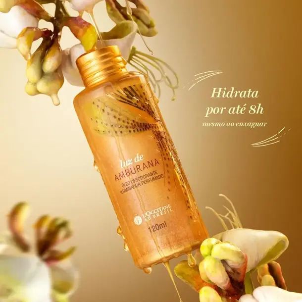 Revela a luz das flores de amburana pelo brilho dourado na pele, deixando-a perfumada ao longo do dia com um caminho ambarado gourmand floral. Hidrata por até 8 horas mesmo no uso com enxágue. Contém Óleo de Amburana.