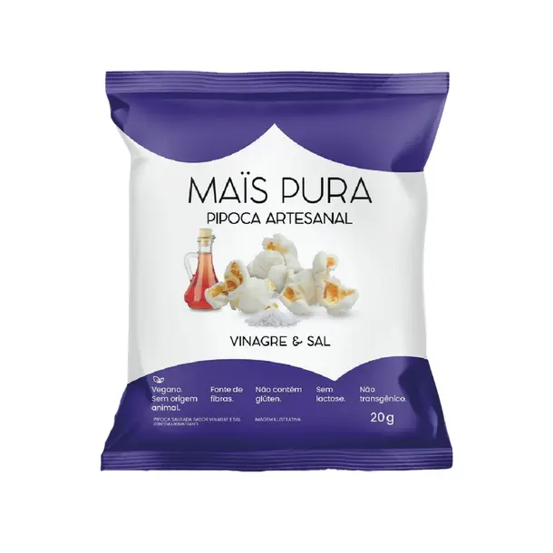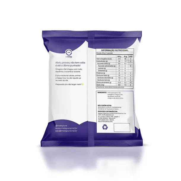 Vinagre e Sal chegou com tudo: Azedinha, crocante e viciante. É pra maratonar séries, animar o happy hour ou dar aquele up no meio do dia. INGREDIENTES: milho para pipoca não transgênico integral, óleo de girassol, aroma de vinagre e sal, ácido cítrico. NÃO CONTÉM GLÚTEN Após aberto consumir imediatamente / Conservar em local seco e fresco.