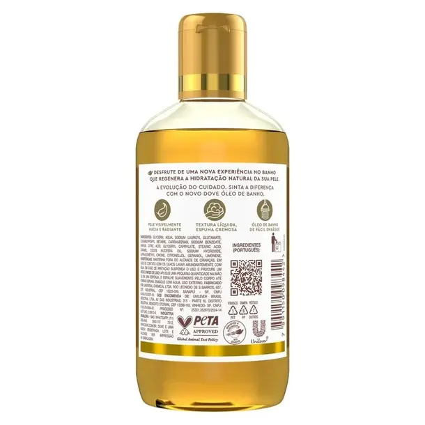 • O Dove Óleo de Banho possui uma textura líquida, espuma cremosa e enxágue fácil Desfrute de uma nova experiência no banho que regenera a hidratação natural da sua pele.